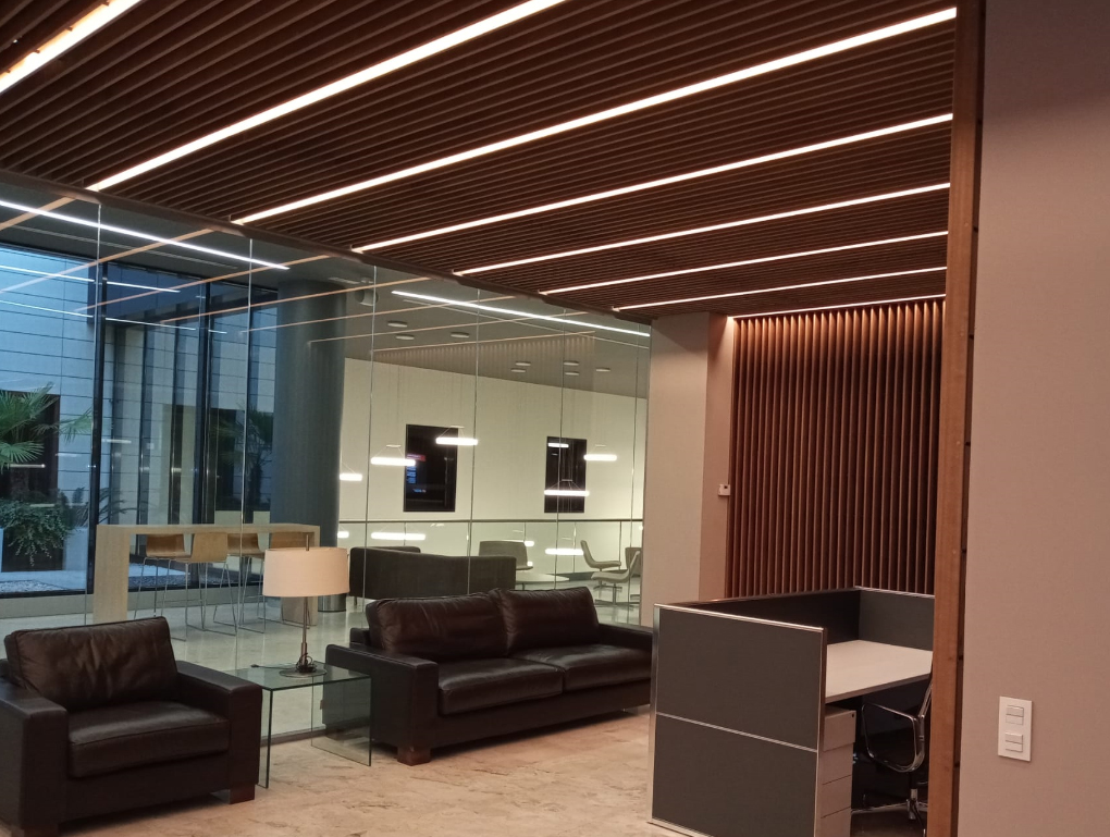 En esta ocasión se optó, también, por el modelo 5-15-70-55 del Sistema Grid de Spigoline acabado en ayous macizo tintado PSM R12354 con tratamiento ignífugo. Destaca la excelente ejecución de la incrustación de las luminarias en los techos de diseño, simulando ser una lama más y creando un efecto óptico espectacular.