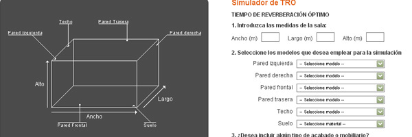 El Simulador “On Line” de TRO (Tiempo de Reverberación Óptimo) es una buena herramienta para quien desea realizar el acondicionamiento acústico de una sala pues permite conocer, de manera orientativa, estos dos datos. Para ello deberás introducir las siguientes variables:.