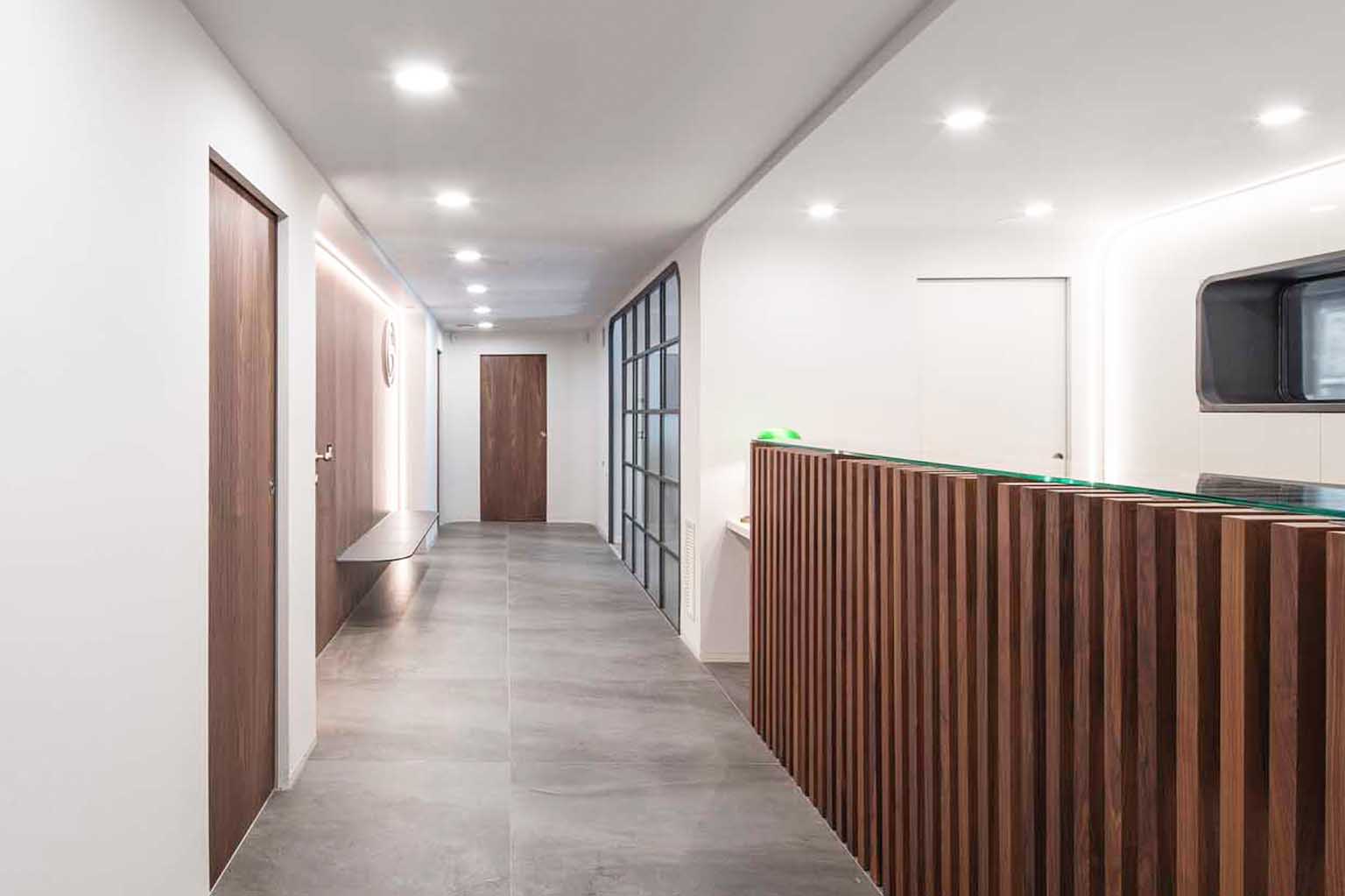 Often, in order to successfully carry out decoration and interior design projects with personality, it is necessary to custom design some elements and, on this occasion, it was necessary to do so. We design and manufacture custom Spigodoor flush doors and panelling for access to rooms and offices, as well as matching cabinets and panelling in offices. We also installed Spigotec brand smooth wood interior cladding.