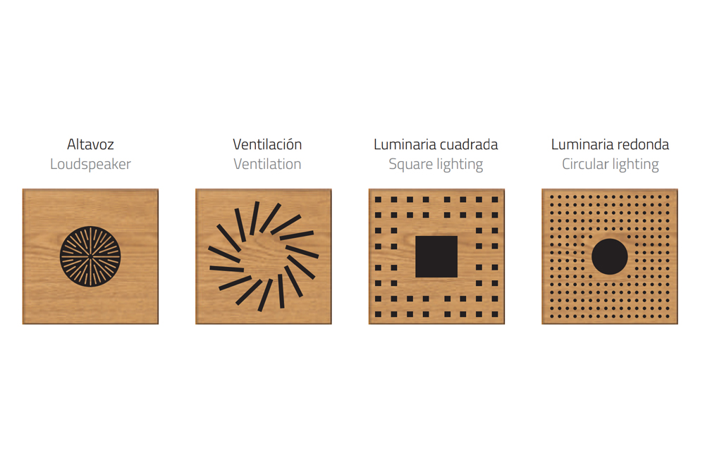 The advance of home automation and the technology applied to construction has put dozens of new surveillance systems, security, detectors and sensors on the market that can also be discreetly integrated into the wood accessible ceilings used in homes, offices and community service buildings. If you need a special complement to integrate a device in a ceiling, consult us about it. At Spigogroup, we are manufacturers and we can design special tiles to suit your needs.