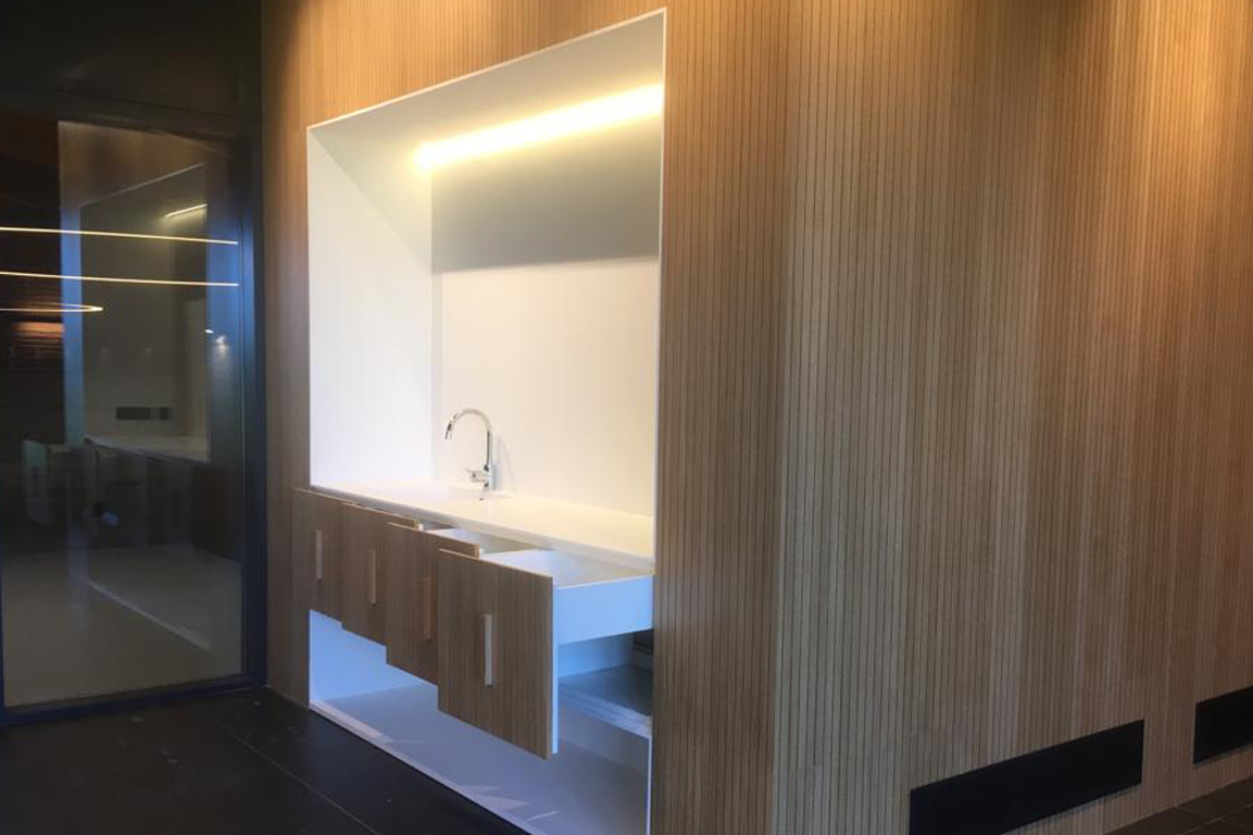 The pictures in this article are of a bespoke project for Barón de Ley winery in La Rioja. In this case, Spigoacustic acoustic panels, model 28-32-32, were fitted into the cabinet island of the winery’s tasting room. The project housed the tasting washbasins, whilst the oak finish sound-absorbent cladding concealed drawers, cupboard doors and other storage points.