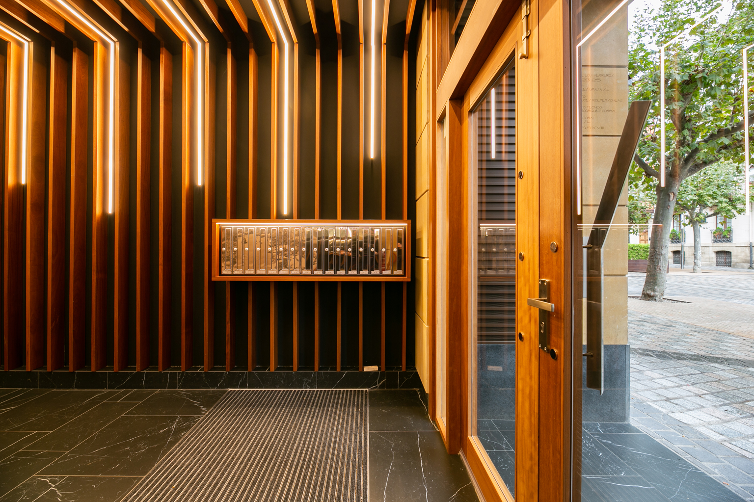 The Rioja-based architect’s studio, Arquitect , took care of the refurbishment and renovation work of its entrance foyer and commissioned us to carry out the wood interior cladding. The aim was to achieve a welcoming, elegant, modern atmosphere, and the studio opted for Spigoline solid wood slats, made to measure, in combination with mirrors, marble and integrated LED lighting. The 3500×120 cm slats are made of solid iroko wood with natural wood effect varnish. Smooth wood cladding was chosen for utility covers and the entrance door was also made of iroko wood. The result is spectacular and the building now has a modern, welcoming, distinguished and very comfortable entrance.