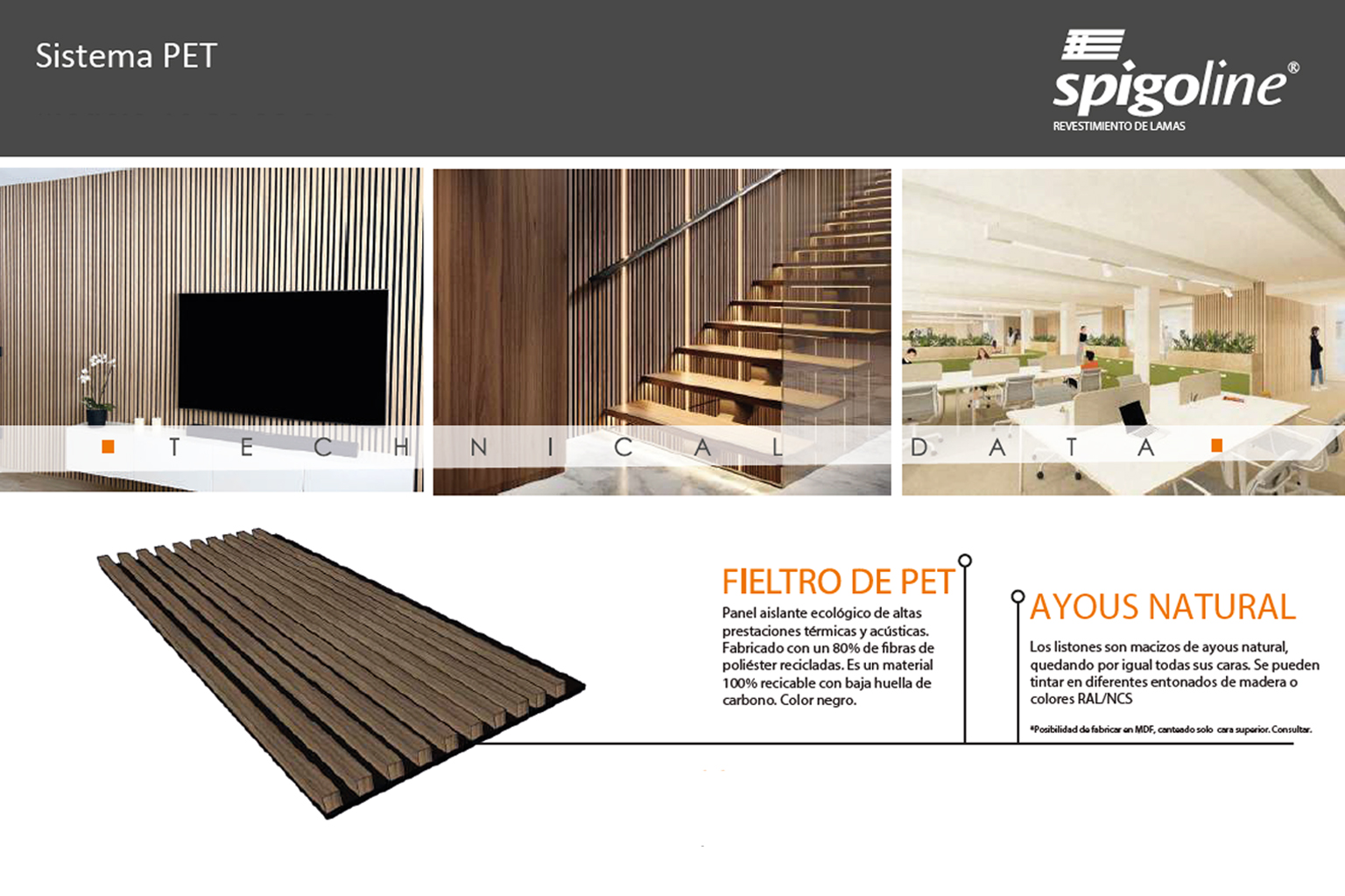 Le système PET existe dans 4 modèles différents (15-30, 10-30-35-30, 12-35-15-15 y 12-35-30-15). Avec les 36 modèles du système GRID, les 12 du système ACÚSTICO et les 22 du système LINEAL, il vient compléter le vaste catalogue de lames pour revêtements intérieurs en lames en bois massif de Spigoline.