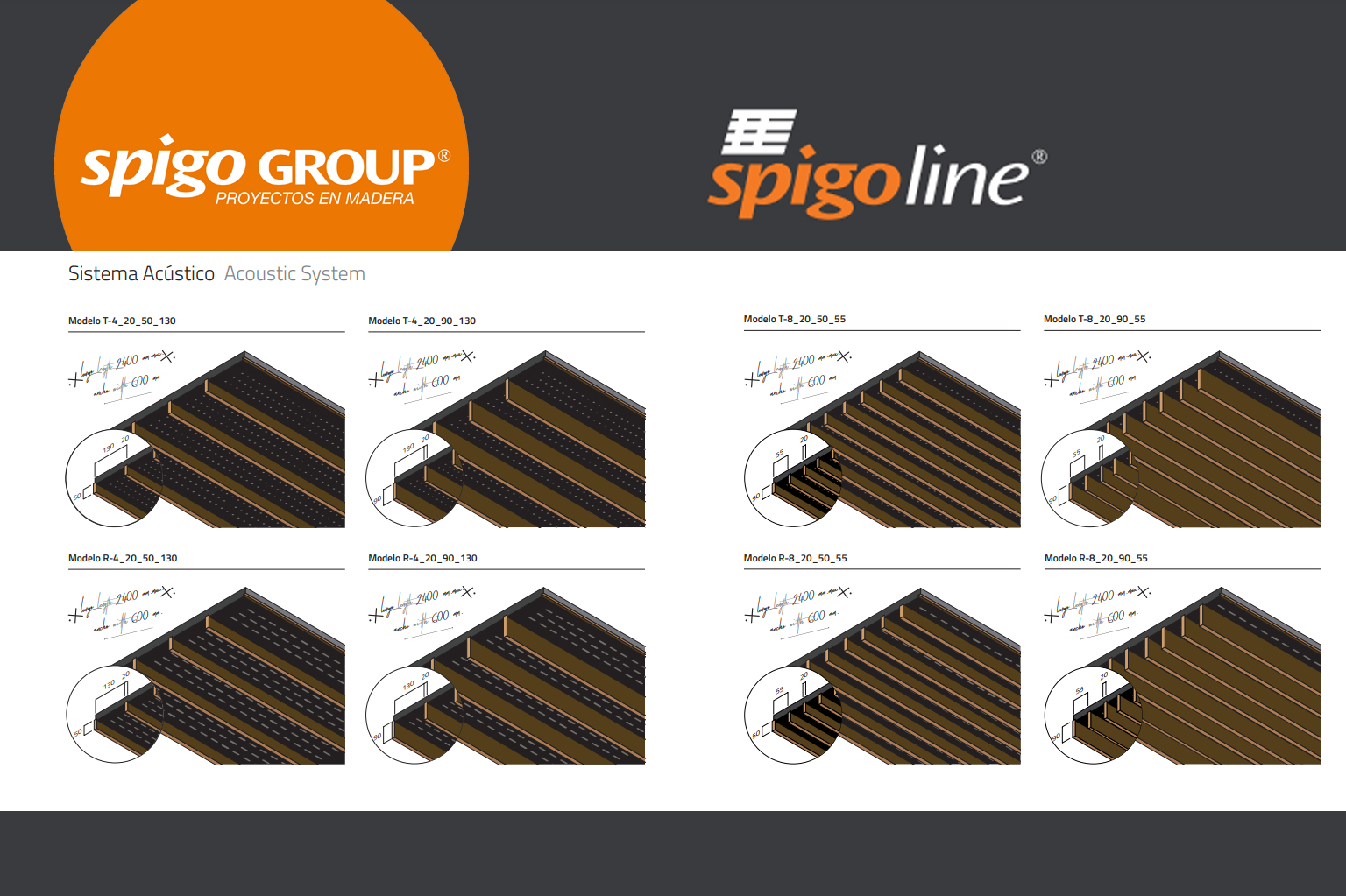 Spigoline, la marca de Spigogroup dedicada a la fabricación de revestimientos de lamas de madera maciza, ofrece los modelos del Sistema Acústico. Este revestimiento, utilizado en techos y paredes, está formado por un tablero contrachapado perforado (con perforación oblonga o circular) y por lamas de madera maciza (secciones cuadradas o rectangulares) colocadas paralelamente entre sí. Tanto en paredes como en techos, se instala mediante un sistema de ensamblado de parrillas a través de una estructura de rastreles y su posterior colocación mediante tirafondos a dichas parrillas.