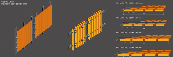 Por otro lado, el sistema de lamas de madera de Spigoline llamado Sistema Lineal está formado por lamas de madera en MDF de sección rectangular colocadas en paralelo y unidas mediante lamas de madera transversales. En este caso, la instalación de las lamas de madera es similar tanto en techos como en paredes: con tirafondos a rastrel de madera con éste colocado siempre en perpendicular a la dirección de la lama. El Sistema Lineal permite la colocación de lamas de madera tanto en vertical como en horizontal.