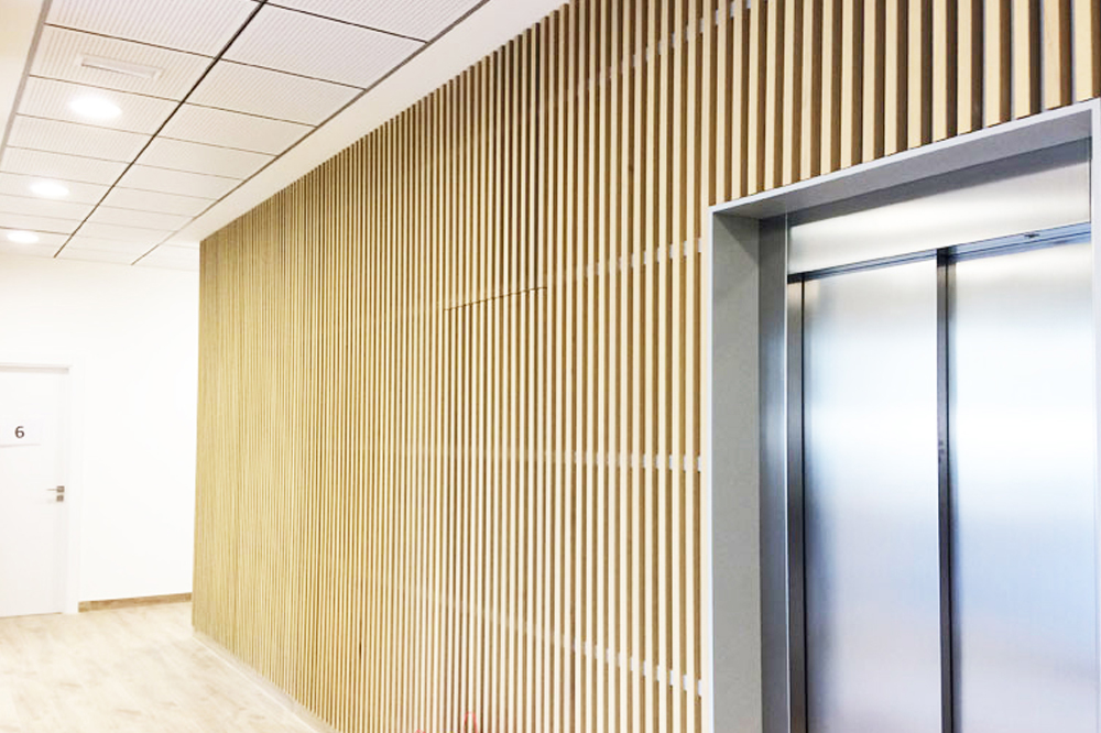 Por un lado, colocar lamas en una pared transforma el espacio. Aporta verticalidad y orden, y cambia la perspectiva visual de una habitación. En una recepción de hotel o empresa, el uso de lamas de madera traslada al visitante la sensación de seriedad y serenidad, de estar en un lugar donde todo está bajo control para garantizar la mejor experiencia.