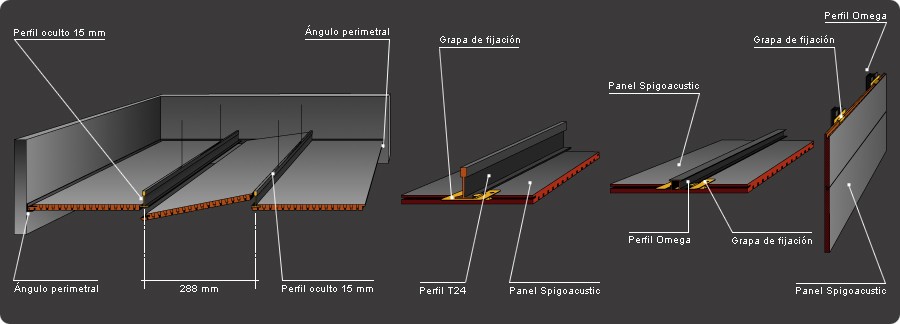 Aunque se recomienda que la instalación la realice un profesional, el sistema de montaje es muy sencillo y rápido. Básicamente se instala una perfilería metálica sobre la cual iremos colocando los paneles acústicos, que van uniéndose entre ellos mediante un sistema de machihembrado, hasta completar los techos acústicos y paredes con este tipo de revestimiento de madera especial.