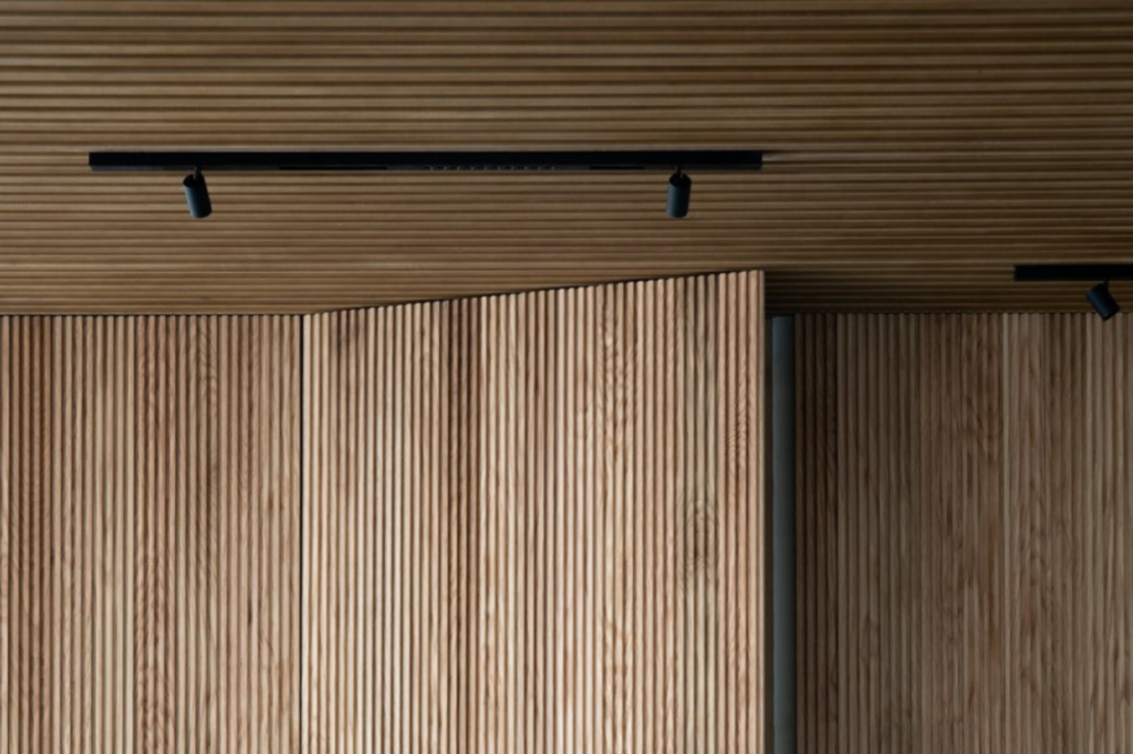 - Paneles de madera decorativos Spigoplank 01 en roble macizo, utilizado en las paredes de algunas zonas comunes como el área de ascensores. Un modelo de instalación muy rápida sin obra que presenta una superficie tridimensional longitudinal a modo de listón de madera, de 10 mm de grosor y 10 mm de separación entre listones. Ver ficha técnica