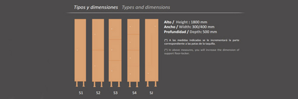 Spigocompac ofrece 5 tipos de módulos de taquillas fenólicas (S1-S2-S3-S4-S5-SJ) dependiendo del número y modelo de puertas que dispongan. Estos módulos de taquillas fenólicas tienen unas medidas estándar de 1.800 mm. de alto, 300/400 mm. de ancho y 500 mm. de profundidad, y con ellos se pueden componer conjuntos completos de taquillas fenólicas según las necesidades y espacio disponible en cada proyecto. Incluso, si fuera necesario, como somos fabricantes podemos realizar modificaciones o proyectos a medida.